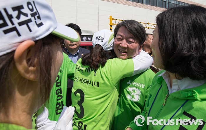 (안산=포커스뉴스) 안철수 국민의당 상임공동대표가 1일 오후 안산시 상록구 상록수역 월드프라자 앞에서 김영환 상록구을 후보와 박주원 상록구갑 후보 지원 유세를 하던 중 한 선거운동원에게 안기고 있다.