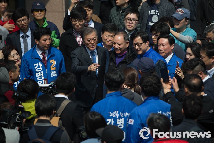 (서울=포커스뉴스) 1일 오후 문재인 전 더불어민주당 대표가 서울 은평구 연신내역 앞에서 강병원 은평을 후보와 함께 유세를 하고 있다.