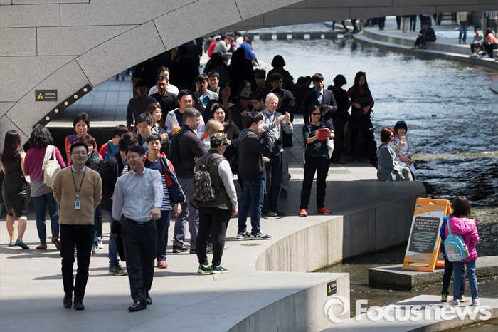 (서울=포커스뉴스) 완연한 봄 날씨를 보인 1일 오후 서울 종로구 청계천을 찾은 시민들이 봄 날씨를 만끽하고 있다.