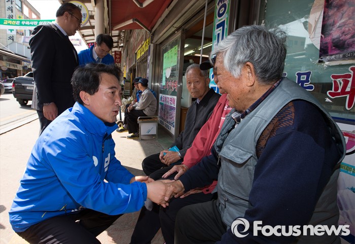 (공주=포커스뉴스) 1일 충남 공주시 산성시장 일원에서 박수현 더불어민주당 후보가 지지를 호소하고 있다.