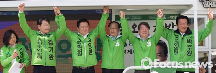 (안산=포커스뉴스) 안철수 국민의당 상임공동대표(오른쪽 두번째)가 1일 오후 안산시 상록구 상록수역 월드프라자 앞에서 김영환 상록구을 후보와 박주원 상록구갑 후보 지원 유세를 하고 있다. 오른쪽부터 박 후보, 안 대표, 비례대표후보 오세정 교수, 김 후보, 김기완 단원갑 후보