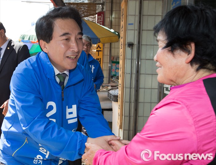 (공주=포커스뉴스) 1일 충남 공주시 산성시장 일원에서 박수현 더불어민주당 후보가 지지를 호소하고 있다.