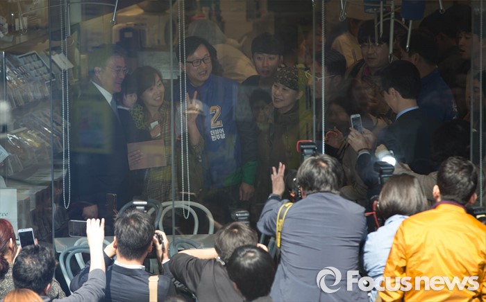 (서울=포커스뉴스) 1일 오후 문재인 전 더불어민주당 대표가 서울 은평구 연신내역 앞에서 강병원 은평을 후보와 함께 유세를 하고 있다.