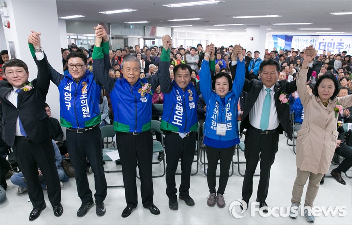 (익산=포커스뉴스) 김종인 더불어민주당 비대위 대표 겸 선대위원장과 내빈들이 1일 오후 한병도 전북 익산을 후보 선거사무소에서 열린 개소식에 참석해 취재진을 향해 손을 들어 인사하고 있다. 왼쪽부터 최재성 의원, 최영규 도의원 후보, 김 대표, 한 후보, 강팔문 익산시장 후보 부인, 정청래, 임수경 의원.