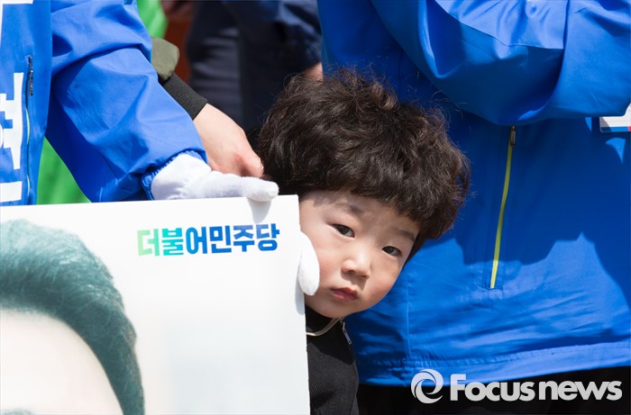 (공주=포커스뉴스) 1일 충남 공주시 산성시장 일원에서 어린이가 박수현 더불어민주당 후보의 연설에 관심을 보이고 있다.