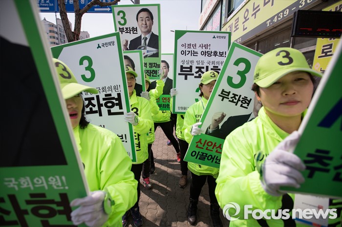 (안산=포커스뉴스) 국민의당 선거운동원들이 1일 오후 안산시 단원구 초지동에서 부좌현 단원구을 후보 지원 유세를 하고 있다.