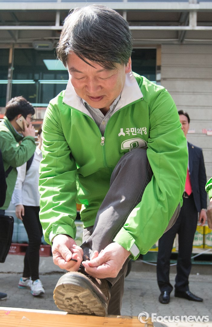 (안산=포커스뉴스) 안철수 국민의당 상임공동대표가 1일 오전 안산시 단원구 초지동에서 부좌현 단원구을 후보 지원 유세를 하고 있다.