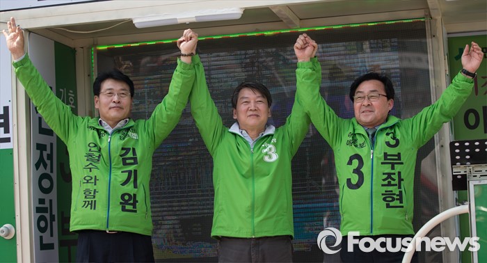 (안산=포커스뉴스) 안철수 국민의당 상임공동대표(가운데)와 김기완 단원갑 후보가 1일 오전 안산시 단원구 초지동에서 부좌현 단원구을 후보 지원 유세를 하고 있다.