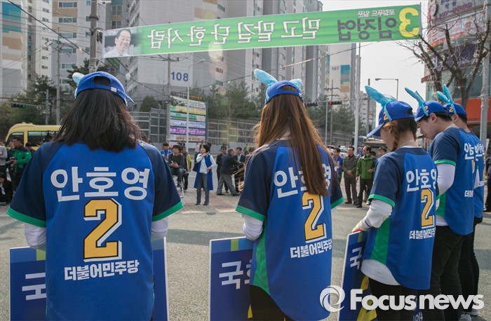 (완주=포커스뉴스) 1일 오후 전북 완주군 둔산공원 앞 사거리에서 안호영 더불어민주당 완주·진안·무주·장수군 후보의 선거운동원들이 지지를 호소하고 있다.