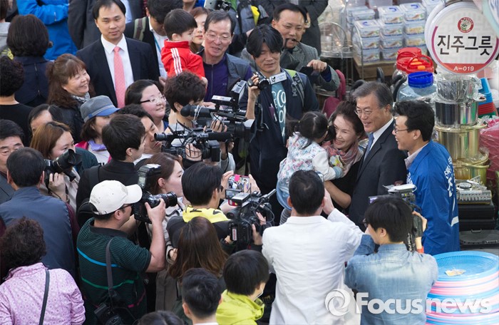 (서울=포커스뉴스) 1일 오후 문재인 전 더불어민주당 대표가 서울 강서구 방신재래시장에서 진성준 강서을 후보와 함께 유세를 하고 있다.