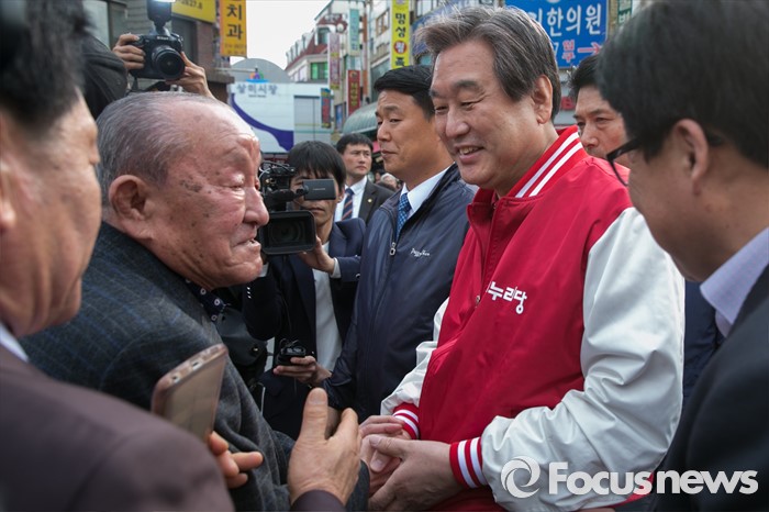 (시흥=포커스뉴스) 김무성 새누리당 대표가 1일 오후 경기도 시흥시 삼미시장 입구에서 함진규 시흥갑 후보 지원 유세를 마친 뒤, 시민들과 악수하고 있다.