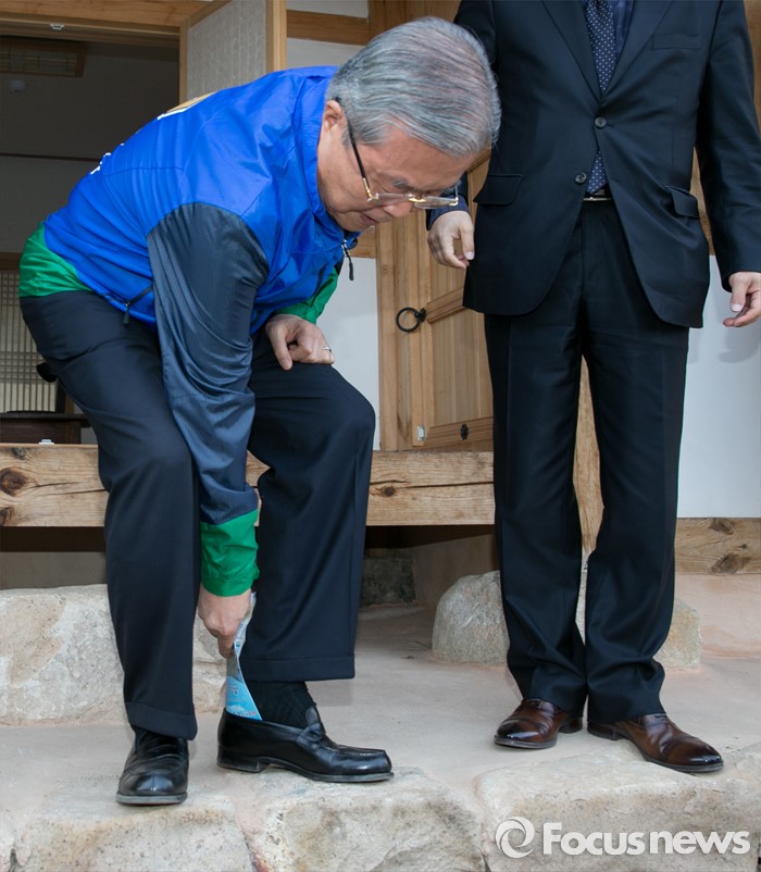 (순창=포커스뉴스) 김종인(왼쪽) 더불어민주당 비대위 대표 겸 선대위원장이 1일 오후 전북 순창군 가인 김병로 선생 생가를 방문해 관계자 설명을 들으며 내부를 둘러본 뒤 신발을 신고 있다.