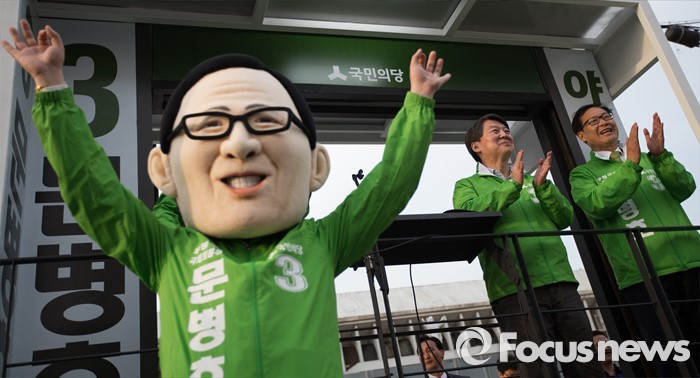 (인천=포커스뉴스) 안철수 국민의당 상임공동대표가 1일 오후 인천시 부평구 부평 4동에서 문병호 부평구갑 후보 지원 유세를 하고있는 가운데 문병호 얼굴을한 인형탈 '문병팔'이 기호 3번을 그리고 있다.