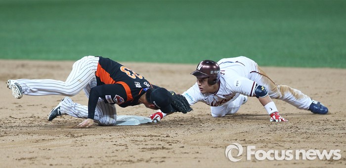 (서울=포커스뉴스) 1일 오후 서울 구로구 고척스카이돔에서 열린 2016 타이어뱅크 프로야구 개막전 넥센 히어로즈와 롯데 자이언츠의 경기 2회말 1사 1루 상황 넥센 박동원이 2루타를 성공시키고 있다.