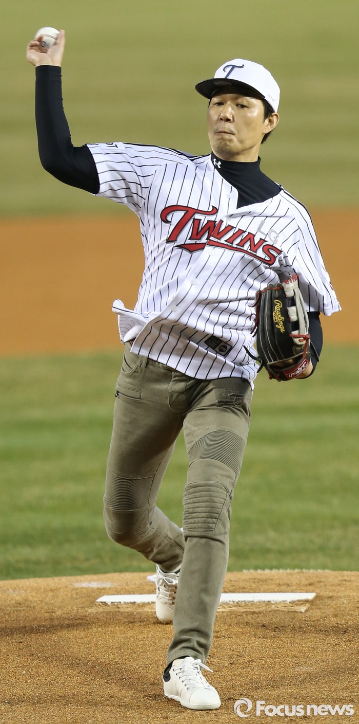 (서울=포커스뉴스) 1일 서울 잠실구장에서 열린 2016프로야구 개막전 한화-LG 경기에서 LG 골수팬인 배우 박성웅이 시구하고 있다.