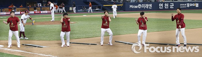 (서울=포커스뉴스) 1일 오후 서울 구로구 고척스카이돔에서 열린 2016 타이어뱅크 프로야구 개막전 넥센 히어로즈와 롯데 자이언츠의 경기 클리닝 타임 중 구단 직원들이 춤을 추고 있다.
