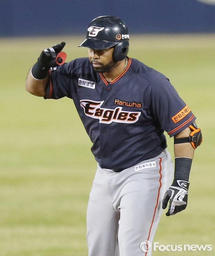 (서울=포커스뉴스) 1일 서울 잠실구장에서 열린 2016프로야구 개막전 한화-LG 경기에서 3회초 한화 로사리오가 2루타를 치고 2루에서 덕아웃을 향해 경례를 하고 있다.