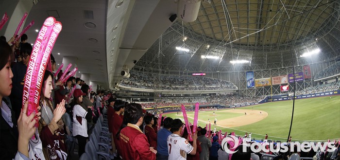 (서울=포커스뉴스) 1일 오후 서울 구로구 고척스카이돔에서 열린 2016 타이어뱅크 프로야구 개막전 넥센 히어로즈와 롯데 자이언츠의 경기에서 관중들이 응원을 펼치고 있다.