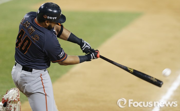 (서울=포커스뉴스) 1일 서울 잠실구장에서 열린 2016프로야구 개막전 한화-LG 경기 7회초 2사 1루에서 한화 로사리오가 왼쪽 펜스 앞까지 날아가는 타구를 날리고 있다.