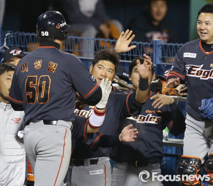 (서울=포커스뉴스) 1일 서울 잠실구장에서 열린 2016프로야구 개막전 한화-LG 경기 9회초 1사 1루에서 한화 이성열이 우익수 앞 안타를 치고 대주자로 교체돼 덕아웃으로 들어오며 동료들의 환영을 받고 있다. 이성열은 4타수 4안타를 쳤다.