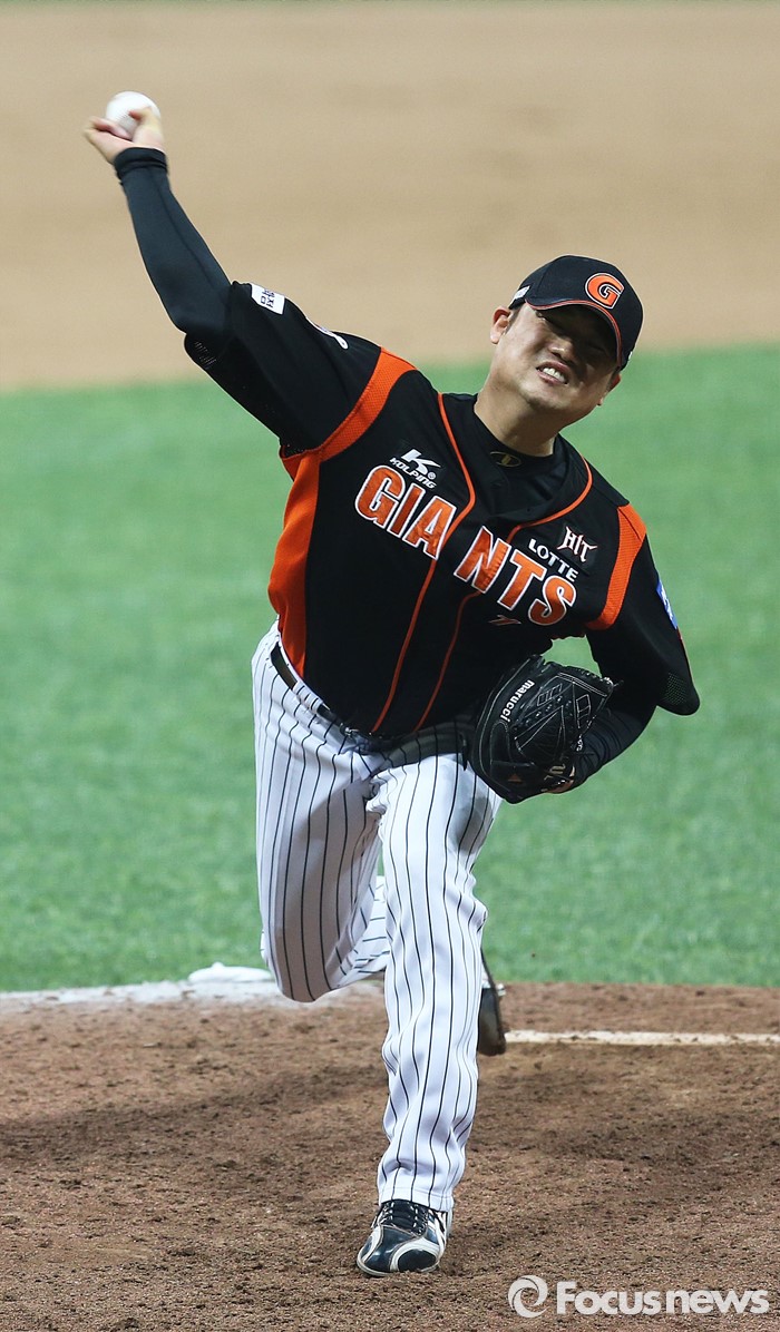 (서울=포커스뉴스) 1일 오후 서울 구로구 고척스카이돔에서 열린 2016 타이어뱅크 프로야구 개막전 넥센 히어로즈와 롯데 자이언츠의 경기 9회말 롯데 마무리 투수 손승락이 투구하고 있다.