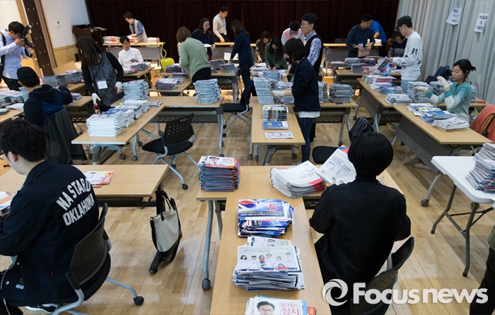(서울=포커스뉴스) 2일 오후 서울 성북구 안암동주민센터에서 관계자들이 가정으로 발송될 제20대 국회의원 선거 공보물을 정리하고 있다.