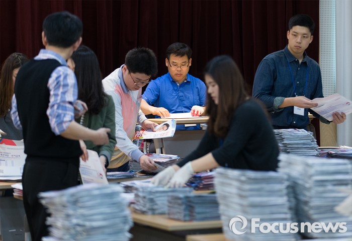 (서울=포커스뉴스) 2일 오후 서울 성북구 안암동주민센터에서 관계자들이 가정으로 발송될 제20대 국회의원 선거 공보물을 정리하고 있다.