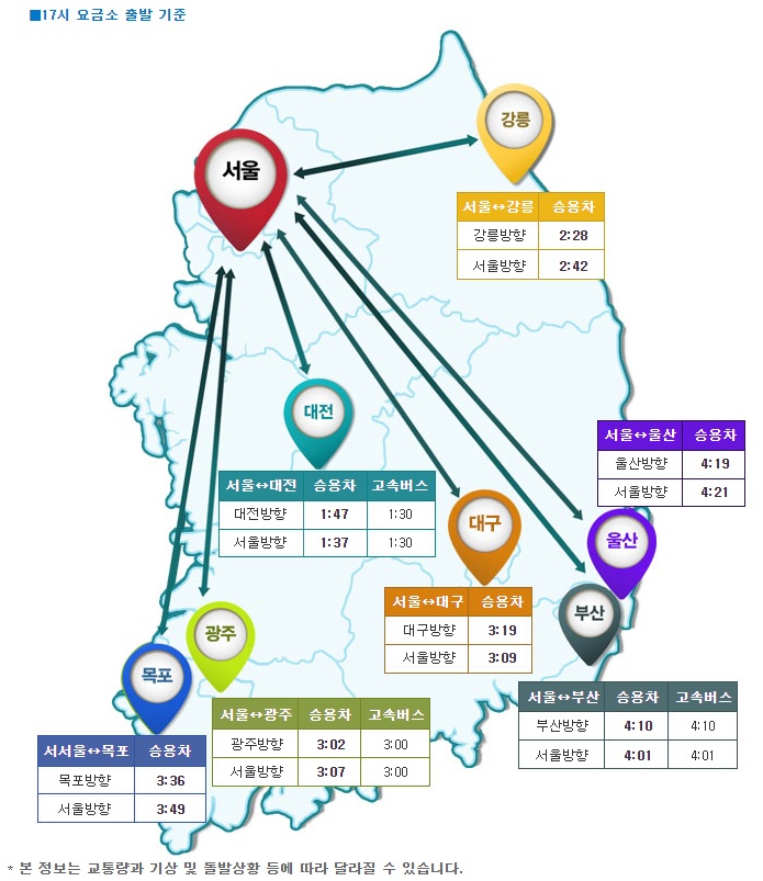 주요 도시에서 서울까지 소요되는 시간은 오전 10시 기준 강릉 2시간 42분, 부산 4시간, 광주 3시간 7분, 목포 3시간 49분, 대전 1시간 17분 등이다.