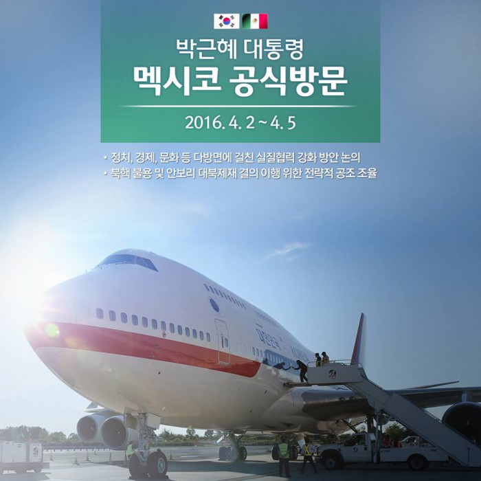 박 대통령은 멕시코 공식 방문을 마치고 5일 귀국길에 오른다.미국 워싱턴에서의 핵안보정상회의 일정을 마친 박근혜 대통령이 우리시간으로 3일 새벽 멕시코에 도착했다. 2016.04.03. 그래픽 출처=청와대