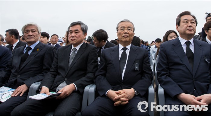 (제주=포커스뉴스) 3일 오전 제주 4ㆍ3 평화공원에서 열린 제68주년 4ㆍ3희생자 추념식에 참석한 김세균(왼쪽부터) 정의당 공동대표, 이상돈 국민의당 공동선대위원장, 김종인 더불어민주당 비상대책위원회 대표,김무성 새누리당 대표가 착석하고 있다.