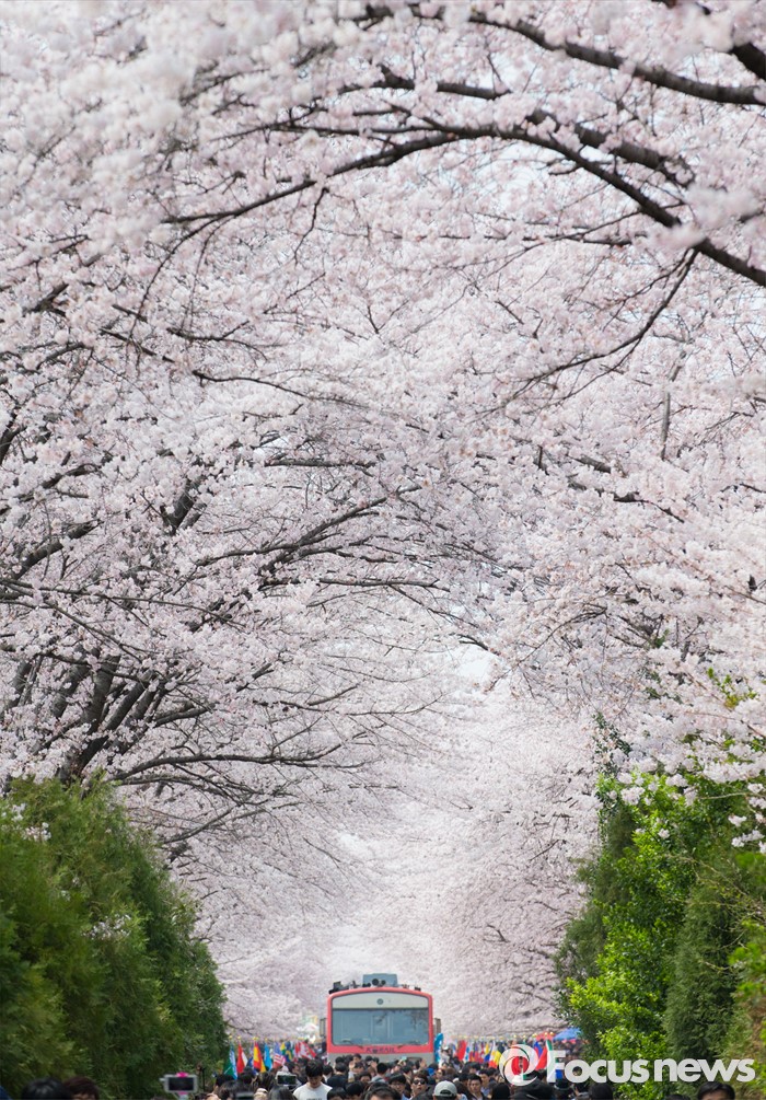 (창원=포커스뉴스) 2일 오후 경남 창원시 진해구 경화역을 찾은 관광객들이 만개한 벚꽃을 보며 즐거운 시간을 보내고 있다.