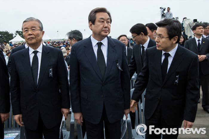 (제주=포커스뉴스) 3일 오전 제주 4ㆍ3 평화공원에서 열린 제68주년 4ㆍ3희생자 추념식에 참석한 황교안(맨 오른쪽) 국무총리가 김무성 새누리당 대표, 김종인 더불어민주당 비상대책위원회 대표에게 착석을 권하고 있다.