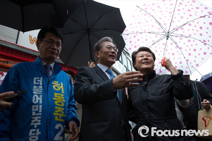 (서울=포커스뉴스) 선거운동이 시작되고 첫 주말을 맞은 3일 오후 문재인 전 더불어민주당 대표가 서울 동작구 남성시장에서 허동준 더불어민주당 동작을 후보와 합동유세를 했다. 한 시민이 문재인을 지지하는 손펫말을 들고 있다.