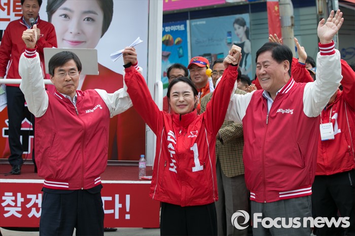 (부산=포커스뉴스) 최경환(오른쪽) 전 경제부총리와 손수조 새누리당 부산 사상구 후보, 조경태 의원이 3일 오후 부산광역시 사상구 광장로의 한 대형마트 앞에서 열린 손 후보 유세에서 손을 들고 있다.