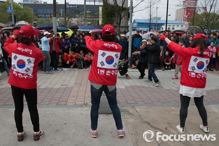 (부산=포커스뉴스) 3일 오후 부산광역시 사상구 광장로의 한 대형마트 앞에서 선거운동원들이 손수조 새누리당 사상구 후보 지원유세를 하고 있다.