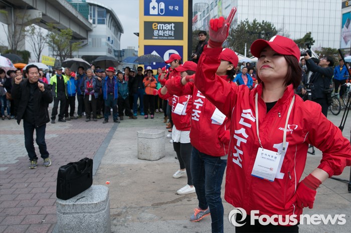 (부산=포커스뉴스) 3일 오후 부산광역시 사상구 광장로의 한 대형마트 앞에서 선거운동원들이 손수조 새누리당 사상구 후보 지원유세를 하고 있다.