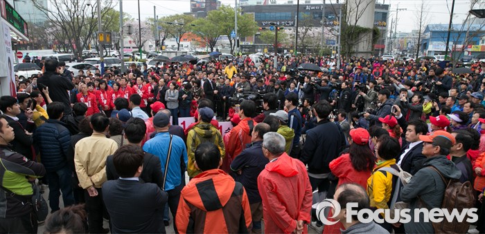 (부산=포커스뉴스) 3일 오후 부산광역시 사상구 광장로의 한 대형마트 앞에서 시민들이 손수조 새누리당 사상구 후보 유세를 보고 있다.