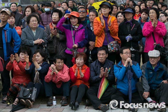 (부산=포커스뉴스) 3일 오후 부산광역시 사상구 광장로의 한 대형마트 앞에서 시민들이 손수조 새누리당 사상구 후보 유세를 보고 있다.