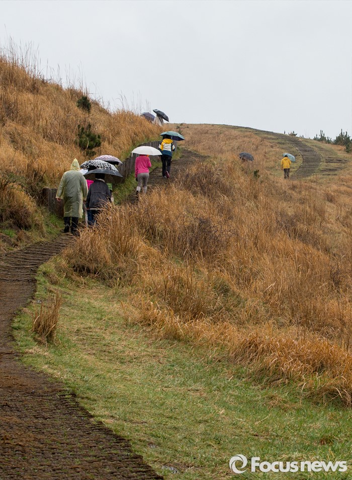(제주=포커스뉴스) 3일 오후 제주 용눈이오름을 찾은 관광객들이 제주의 풍광을 즐기고 있다.