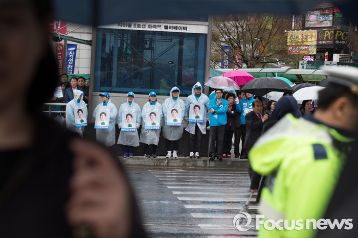 (서울=포커스뉴스) 3일 오후 서울 강서구 화곡역 사거리에서 김종인 더불어민주당 비대위 대표 겸 선대위원장이 강서갑 금태섭, 강서병 한정애 후보와 함께 유세를 하고 있는 모습을 지지자들이 바라보고 있다.