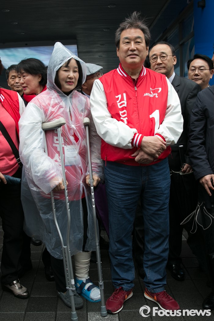 (부산=포커스뉴스) 부산광역시 중구영도구에 출마한 김무성 새누리당 대표가 3일 오후 부산시 중구 자갈치시장 공동어패류조합 앞에서 유세 전, 부인 최양옥 씨와 함께 서 있다. 최 씨는 선거운동 중, 발에 금이 가는 부상을 당한 것으로 알려졌다.