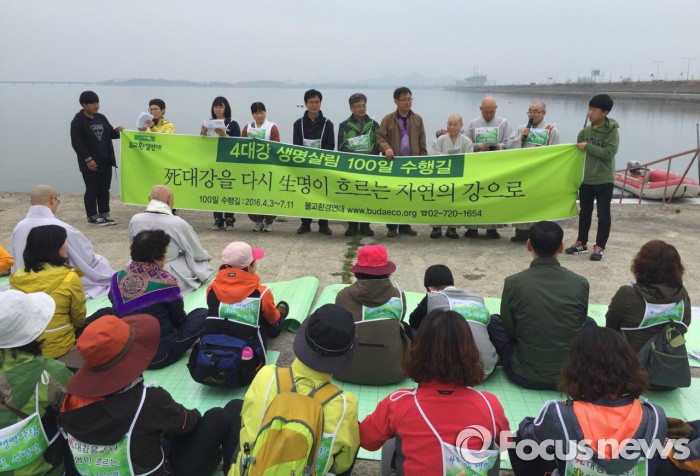 2016년 4월 3일 목포의 영산강 하구둑 바로 옆 목포해양스포츠센터 앞의 수변에 80여명의 불교환경연대회원들과 스님들이 모였다. <4대강 생명살림 100일 수행길>의 시작을 알리는 입재식을 시작으로 7월 11일까지 영산강, 금강, 낙동강을 거쳐 한강으로 100일간 수행 길을 걸을 예정이다.