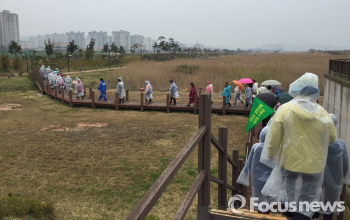 (목포=포커스뉴스) 불교환경연대소속 회원들이 3일 전남 목포시 영산강하구에서 사대강 생명살림 100일 순례를 시작하면서 포장된 자전거길을 걷고 있다..<사진=불교환경연대제공>