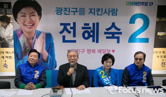 (서울=포커스뉴스) 4일 오전 전혜숙 더불어민주당 서울 광진갑 후보 선거사무소에서 열린 중앙선거대책위원회의에 참석한 김종인 비대위 대표 겸 선대위원장이 모두발언을 하고 있다. 왼쪽부터 이근식 부위원장, 김 대표, 전 후보, 최동익 부위원장.