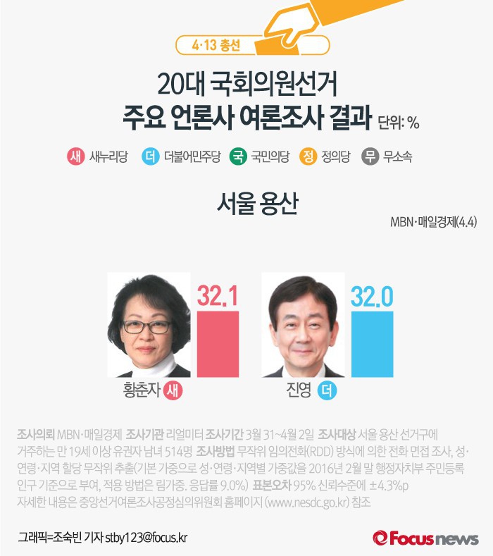 매일경제가 여론조사기관 리얼미터에 의뢰해 4일 발표한 결과에 따르면 서울 용산 지역구 후보 지지율에서 황춘자 후보는 32.1%, 진영 의원은 32%를 기록했다. 두 후보 간 격차는 0.1%p에 불과하다.