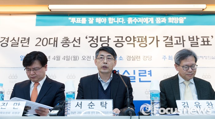 (서울=포커스뉴스) 4일 오전 서울 종로구 경제정의실천시민연합에서 서순탁(가운데) 경실련 20대 국회의원 선거 정책공약검증단장 20대 총선 정당 공약평가 결과발표 기자회견을 하고 있다.
