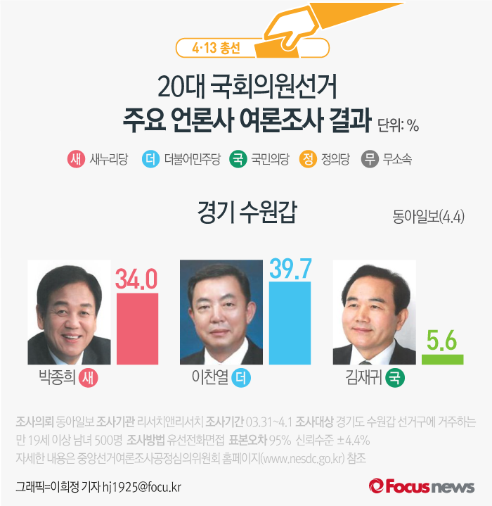 (서울=포커스뉴스) 동아일보가 리서치앤리서치에 의뢰해 4일 발표한 여론조사 결과에 따르면 새누리당 박종희 후보의 지지율은 34.0%, 더불어민주당 이찬열 후보의 지지율은 39.7%, 국민의당 김재귀 후보는 5.6%를 기록했다.