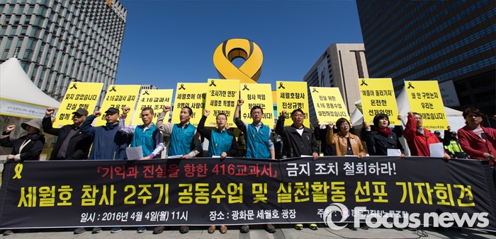 (서울=포커스뉴스) 4일 오전 서울 광화문광장에서 전국교직원노동조합 조합원들이 세월호 참사 2주기 공동수업 및 실천활동 선포 기자회견 중 교육부의 416교과서 금지 조치 철회 촉구하는 구호를 외치고 있다.