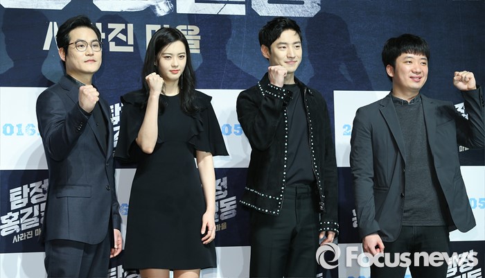 (서울=포커스뉴스) 4일 오전 서울 강남구 압구정 CGV에서 열린 영화 '탐정 홍길동 : 사라진 마을' 제작보고회에 참석한 배우 김성균(왼쪽부터), 고아라, 이제훈, 조성희 감독이 포토타임을 갖고 있다.