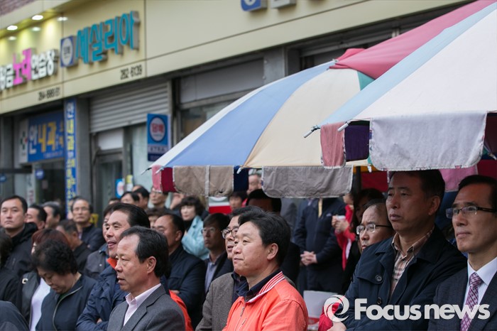 (창원=포커스뉴스) 4일 오전 경남 창원시 성산구 가음정시장 앞에서 시민들이 강기윤 창원시성산 후보 지원유세를 보고 있다.